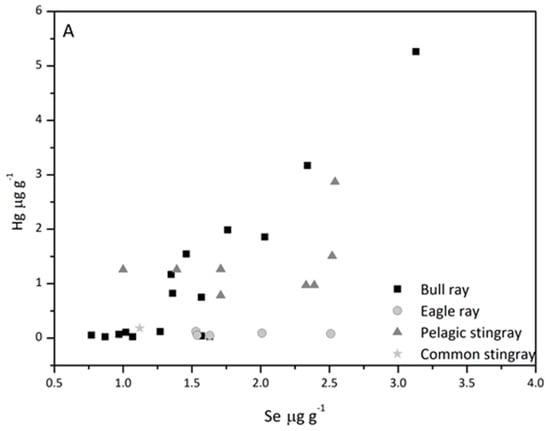 A comparison with other mainly benthic organisms, such as Pagurus s.p., Pilumnus s.p. and Portus depurator which are frequently preyed by benthic rays, from the Gulf of Trieste have a Se content of 0.12–0.52 µg/wet weight, ww or ~0.48–2.08 µg/g dw [,]. Exceptions were mussels (Mytilus galloprovincialis) from the Hg contaminated northern part of the gulf (1.12 µg/k ww, ~4.5 µg/g dw). The Se content of the benthic dwelling fish red mullet (Mullus barbatus) muscle, caught in the Hg contaminated northern part of the gulf was on average 0.27 µg/g ww (~1.1 µg/g dw). The Se contents in the liver and kidney was 1.72 µg/g ww (~6.9 µg/g dw) and 1.56 µg/g ww (~6.2 µg/g dw), respectively, which is about 2–3 fold lower than in the less contaminated areas []. In benthic organisms, levels of Hg were from 0.01–0.34 µg/g ww (~0.04–1.4 µg/g dw) and those of mussels between 0.04–0.2 µg/g ww (~0.2–0.8 µg/g dw) and up to 1.6 µg/g ww (~6.4 µg/g dw) in the Isonzo/Soča polluted area of the gulf. The amounts of Hg in red mullet from the Hg uncontaminated areas of the gulf were 0.1. µg/g ww (~0.4 µg/g dw) in muscle and 0.2 µg/g ww (~0.8 µg/g dw) in liver and kidney but increased to 0.2 µg/g ww in muscle and 0.4 µg/g ww in the liver and kidney in the contaminated northern part of the gulf.
