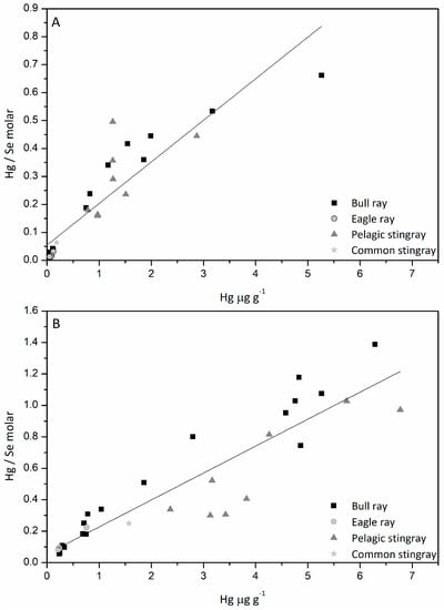 Relationship between Hg/Se ratios (molar) and Hg contents in liver (A) Hg/Se = 0.15Hg + 0.05 (r2 = 0.82, n = 29), and muscle (B) Hg/Se = 0.17Hg + 0.06 (r2 = 0.84, n = 30) of rays.