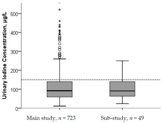 Urinary iodine concentration (UIC) from main study (n = 723) and sub-study (n = 49). Five cases with UIC > 500 µg/L in the main study were excluded from the figure. The stippled horizontal line marks the epidemiological criteria for assessing adequate iodine nutrition based on median UIC by the WHO [5].
