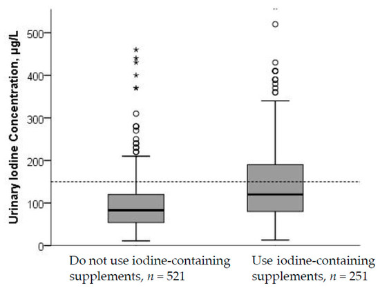 UIC by use of iodine-containing supplements. Five cases with UIC > 500 µg/L were excluded from the figure. The difference in UIC between non-supplement and supplement users was significant (p < 0.001; Mann–Whitney U test). The stippled horizontal line marks the epidemiological criteria for assessing adequate iodine nutrition based on median UIC by the WHO [5].
