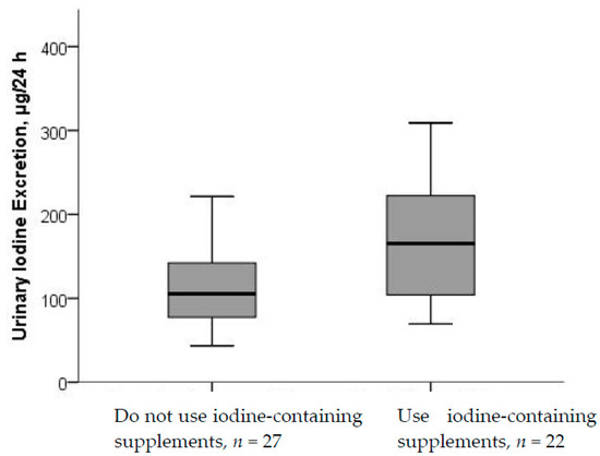 UIE by use of iodine-containing supplements. Differences in UIE between non-supplement and supplement users were significant (p < 0.021; Mann–Whitney U test).
