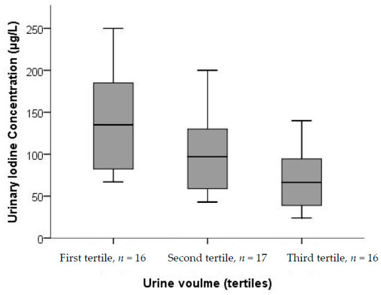 UIC from spot samples in 24-h urine samples by tertiles of total excreted urine volume (n = 49). There were significant differences in UIC between the tertiles (p = 0.002; Kruskal–Wallis test).