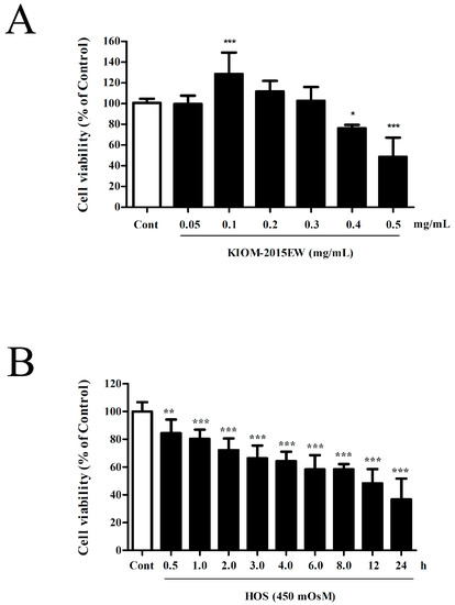 The effects of KIOM-2015EW or hyperosmolar stress (HOS) on cell viability in human corneal epithelial cells (HCECs). (A) HCECs were treated with the indicated dose of KIOM-2015EW for 24 h, and cell viability measured by MTT (3-(4,5-Dimethylthiazol-2-yl)-2,5-Diphenyltetrazolium Bromide) assay; (B) HCECs were exposed to 450 milliosmoles (mOsM) F-12/ Dulbecco’s Modified Eagle Medium (DMEM) serum-free media for the indicated time, and cell viability measured by cell counting kit (CCK)-8 assay. Data are representative of three independent experiments performed in triplicate. Data are summarized as mean ± standard deviation (SD) from three independent experiments. * p < 0.05, ** p < 0.01, and *** p < 0.001 vs. control.