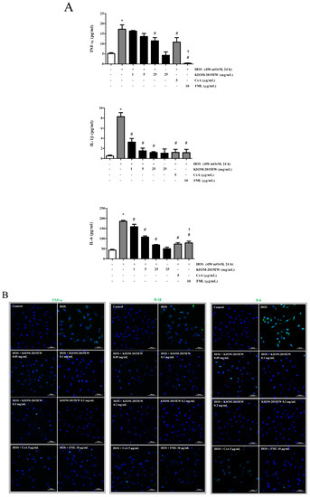 Immunofluorescence staining was performed to detect TNF-α, IL-1β, and IL-6 expression in HCECs. The immunoreactivity of control HCECs to these inflammatory markers was weak (Figure 2B). Positive-staining increased markedly when the cells were exposed to HOS for 24 h, and incubation with KIOM-2015EW attenuated the increased reactivity.