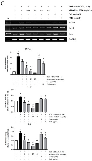 NF-κB activation by HOS has been reported previously. HOS induces nuclear translocation of NF-κB in HCECs and cultured cardiomyocytes with dichotomic actions on caspase activation and cell death [49,61]. Moreover, the transcription factors NF-κB and AP-1 play a major role in the induction-inflammation-related genes (cytokines, cytokine receptors, chemotactic proteins, and adhesion molecules) [62]. Here, we demonstrated that KIOM-2015EW inhibits HOS-induced NF-κB transcriptional activity, indicating that the anti-inflammatory effects of KIOM-2015EW are mediated via this signaling pathway.