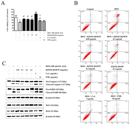 The anti-apoptotic effect of KIOM-2015EW in HOS-induced cell cytotoxicity. HOS-exposed HCECs were treated with KIOM-2015EW for 24 h. CsA and FML were used as positive anti-inflammatory drugs. (A) Cell viability was measured by MTT assay; (B) After incubation with KIOM-2015EW for 24 h, apoptotic HCECs were stained with Annexin V and propidium iodide (PI) and analyzed by flow cytometry. Cells are represented in the dot plot as healthy (Annexin-V−/PI−, lower-left quadrant), early apoptosis (Annexin-V+/PI−, lower-right quadrant), late apoptosis (Annexin-V+/PI+, upper-right quadrant), and necrosis (Annexin-V−/PI+, upper-left quadrant); (C) Expression levels of apoptosis-related markers, including caspase-3, poly (ADP-ribose) polymerase (PARP), Bax, and Bcl-2, were determined by western blot analysis. β-Actin was used as the loading control. The data are presented as the mean ± SD of three independent experiments. * p < 0.05 vs. control, # p < 0.05 vs. HOS, † p < 0.05 vs. KIOM-2015EW (25 μg/mL). The full size blot is shown in Supplementary Figure S2.