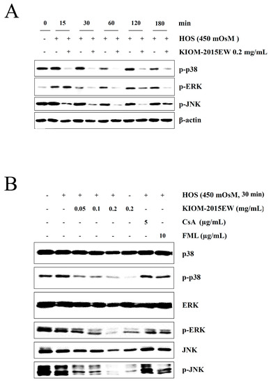 Several studies have reported that HOS activates MAPK signaling [12,13,46,47]. Western blotting with phosphor-specific antibodies revealed that the levels of phosphorylated p38, ERK, and JNK increased dramatically in HCECs within 15–120 min of exposure to 450 mOsM hyperosmolar media (Figure 4A). However, in the KIOM-2015EW (0.2 mg/mL)-treatment group, p38, ERK, and JNK phosphorylation was inhibited at the 15 (p38 and JNK) or 30 min (ERK) points, and the inhibition was sustained until 60 min. Based on these results, HOS- and/or KIOM-2015EW-treatment was performed for 30 min in subsequent assays. In KIOM-2015EW (0.05, 0.1, and 0.2 mg/mL)-treated cells, p38, ERK and JNK phosphorylation decreased in a dose-dependent manner (Figure 4B). However, phosphorylation decreased slightly with CsA- and FML-treatment as well. KIOM-2015EW suppressed HOS-induced increases in MAPK signaling activation (Figure 4).