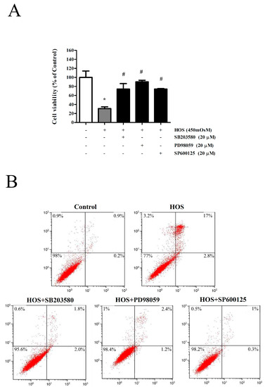 We investigated whether inhibition of MAPK signaling regulates HOS-induced apoptosis. A p38 MAPK inhibitor (SB203580), an ERK inhibitor (PD98059), and a JNK inhibitor, (SP600125) were used to examine MAPK-related apoptosis. After HOS-exposure for 24 h in the presence/absence of SB203580 (20 µM), PD98059 (20 µM), or SP600125 (20 µM), cell-death was assessed by MTT and fluorescence-activated cell sorting (FACS). HOS-induced cytotoxicity and apoptosis were blocked by co-treatment with SB203580, PD98059, and SP600125, as assessed by Annexin V-FITC and PI staining, (Figure 5A,B), suggesting that MAPK plays an important role in HOS-induced apoptosis. In other words, inhibition of HOS-induced apoptosis by KIOM-2015EW is mediated via MAPK signaling.