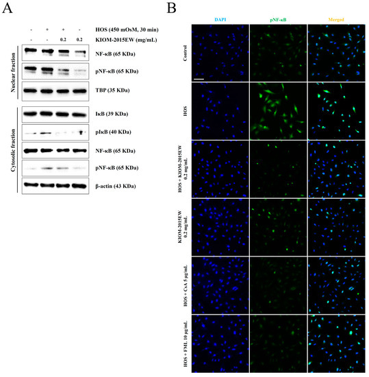 P65 is a key regulator of inflammatory marker genes [48] or pro-apoptotic genes. HOS activates the NF-κB pathway involved the stimulation of IκB kinase (IKK) phosphorylation, IκB-α degradation, p65/RelB NF-κB translocation to the nucleus, and transcriptional activation of NF-κB target genes [49]. Because NF-κB is a major transcription factor that regulates protein expression, we investigated whether KIOM-2015EW inhibits NF-κB release from IκB-α and/or its subsequent translocation from the cytosol to the nucleus. Western blotting using cytosolic factions revealed that IκB phosphorylation was markedly decreased after KIOM-2015EW-treatment (Figure 6A). Immunofluorescence staining revealed that KIOM-2015EW inhibited HOS-induced nuclear translocation of NF-κB (Figure 6B), suggesting that KIOM-2015EW regulates the HOS-mediated IκB–NF–κB circuit.