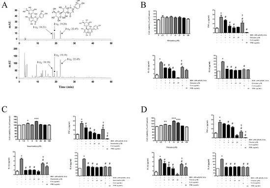 To examine the anti-inflammatory effects of three major compounds, we identified levels of pro-inflammatory cytokines (TNF-α, IL-1β and IL-6) in HOS-treated HCECs (Figure 7). The levels TNF-α, IL-1β and IL-6 were significantly reduced by orientin, isoorientin and vitexin (1, 5 and 25 μM) treatment in HOS-induced cytokines. The anti-inflammatory effects of these compounds were confirmed to be in a dose dependent manner (Figure 7B–D).