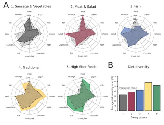 Dietary patterns of the Swiss Population (1977–1993; N = 15,936). (A) Percentage of individuals assigned to a dietary pattern who reported the consumption of the food groups. Grey dashed lines represent the percentage of individuals consuming the 12 food groups in the total study sample. Order of the dietary patterns is random and names were given based on food group consumption; (B) Average dietary variety (%) in individuals following each dietary pattern. Dietary variety is calculated for each participant as the number of food groups consumed divided by the total number of food groups in the diet checklist (12 food groups). Horizontal dashed line indicates the average dietary variety of the total study population.