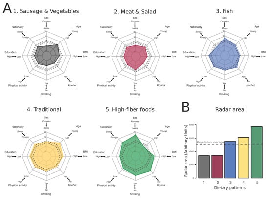 Association between dietary patterns and demographics and lifestyle behaviors (N = 15,936). (A) v-test statistics between individuals assigned to a dietary pattern and the overall population for the eight covariates included in the study. v-test indicates whether categories of participants are significantly over- (v-test > 1.96) or underrepresented (v-test < –1.96) in a dietary pattern compared to the overall study population. Grey dashed lines indicate the non-significant range (−1.96; 1.96). For representation purposes, the six categorical covariates were dichotomized (BMI: “low” < 25 kg/m2 vs. “high” ≥ 25 kg/m2; Alcohol: “no” vs. “yes” moderate or high consumption; Smoking: “no” never vs. “yes” former, light or heavy smoker; Physical activity: “low” ≤ once a week vs. “high” ≥ twice a week; Education: “low” mandatory education vs. “high” upper secondary and tertiary education; Nationality: “Swiss” vs “Foreign”); (B) Areas of the radar plots shown in A (arbitrary units). Horizontal dashed line indicates the radar area of the total study population (all v-tests = 0).