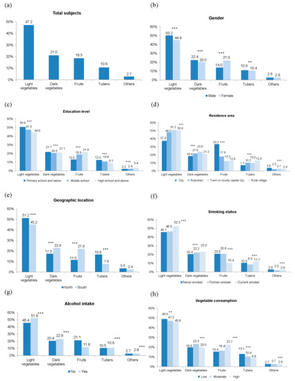 Contribution percentage of food sources to the total vitamin C intake by sociodemographic factors. (a) Total subjects; (b) subgroups by gender; (c) educational level; (d) residence area; (e) geographic location; (f) smoking status; (g) alcohol intake; (h) vegetable consumption. ** p < 0.01, and *** p < 0.001 indicate significant differences in the distribution of the contribution percentages of food sources to the total vitamin C intake by sociodemographic factors by Wilcoxon rank-sum test or Kruskal-Wallis analysis.
