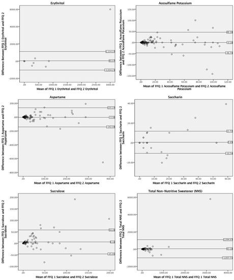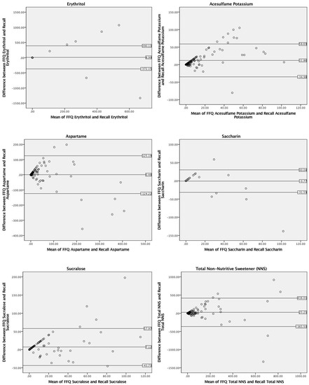 Bland–Altman analyses comparing reported consumption of total and each type of NNS (Figure 3) were conducted to measure agreement of mg intake between the second NNS-FFQ administration and dietary recalls. The second NNS-FFQ was used in this analysis to reflect the same time period during which the dietary recalls were collected. The Bland–Altman analyses revealed agreement levels above the acceptable 95% [20,21,22,23] for total NNS (95.1%), sucralose (95.9%), saccharin (95.9%), erythritol (95.1%) and slightly below for acesulfame potassium (92.7%) and aspartame (94.3%).