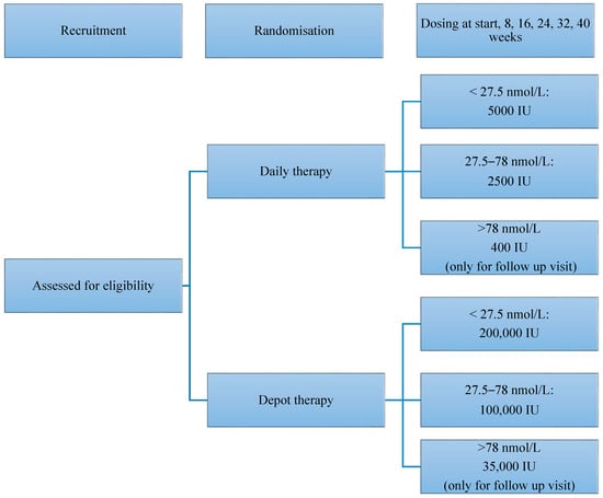 Participants were randomised to receive either daily or depot vitamin D therapy by selecting a number between one and 10 from a sealed opaque envelope (odd numbers assigned to the daily group, even numbers to the depot group). However, if multiple children from the same family were recruited, each were assigned to the same treatment group. Participants remained in the same treatment group for the duration of the study. Follow up appointments were every eight weeks for up to 40 weeks and included a clinical examination, blood test, administration of sun exposure and dietary questionnaires and supply of medication. Depot vitamin D was administered under supervision at the time of the visit. Doses were standardised according to serum 25(OH)D levels at the time of recruitment and subsequent follow up (Figure 1). The total depot dose was slightly lower than the sum of the daily dose over the eight-week period of therapy.