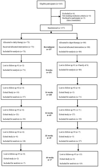 The flow of participants is described according to CONSORT criteria (Figure 2). Of the 163 eligible participants, 157 participants (96.3%) were recruited and randomised to daily (n = 73) or depot therapy (n = 84) at baseline. Six participants did not return after the initial baseline visit and were not included in the data analyses. The final sample for analysis was 151 (92.6%), with 71 receiving daily and 80 receiving depot therapy.