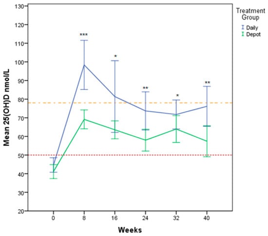 Mean 25(OH)D (nmol/L) change over time for Daily and Depot Treatment Groups. Raw mean 25(OH)D nmol/L change over time. -- represents threshold level 50 nmol/L -- represents threshold level 78 nmol/L * p < 0.05; **p < 0.01; *** p < 0.001.