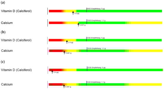 Typical dietary vitamin D and calcium intakes in (a) African; (b) Middle-Eastern and (c) Asian families. (Arrows indicate the actual intake, while vertical lines represent the recommended daily intake). DGE empfehlung = German Nutrition Society (DGE) recommendation