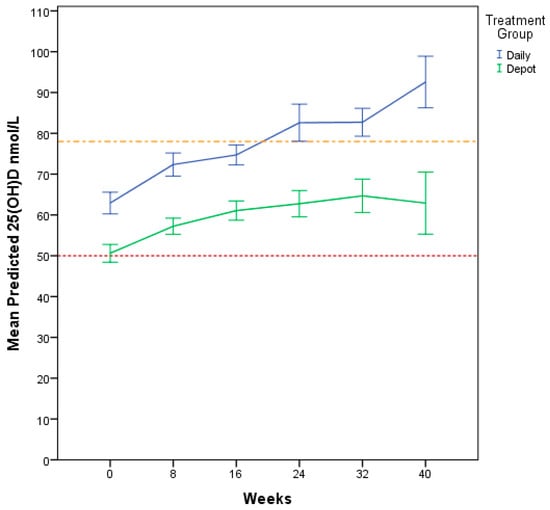 The GLMM for Model 1 (Table 4) revealed time (p < 0.001), sun exposure score (p = 0.046), treatment group (p < 0.001), and calcium (p < 0.001) as significant predictors of 25(OH)D serum levels. Vitamin 25(OH)D serum levels increased over time (β = 4.80, 95% CI 2.47–7.14), and were higher for the daily treatment group (β = 13.59, 95% CI 7.39–19.79). When accounting for contributing factors (Model 1) the predicted 25(OH)D serum levels over time show demonstrated better improvement pattern for participants in the daily treatment group (Figure 5).