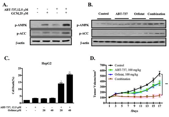 Enhanced de novo fatty acid synthesis is a metabolic hallmark of cancer [22]. Fatty acid synthesis inhibition by targeting key lipogenic enzymes has been recognized as a promising cancer therapeutic approach [23]. Our previous study has shown that GCM can inhibit lipid accumulation in a model of non-alcoholic fatty liver disease [24]. We then asked whether the inhibition of lipogenesis by GCM contributed to its sensitization effect. HepG2 cells were treated with ABT-737 and/or GCM for the indicated times and changes of the key regulators of lipogenesis AMPK and its substrate acetyl-CoA carboxylase (ACC) were assessed to determine if GCM can inhibit fatty acid synthesis in the present setting. As shown in Figure 5A, the phosphorylation levels of AMPK and ACC (inhibitory phosphorylation) were increased by either GCM alone or the combination. Moreover, these changes were also found in the tumor samples (Figure 5B), suggesting the key lipogenic enzyme activity of ACC was inhibited in the presence of GCM. To determine the contribution of ACC inhibition to the sensitization effect, we tested the influences of orlistat, a known ACC inhibitor, on cell death induction by ABT-737 in cell culture model. As shown in Figure 5C, the cell death induction by ABT-737 was significantly increased in the presence of orlistat. We further confirmed these in vitro results in HepG2 xenograft model. The dose of orlistat (100 mg/kg) we used for the in vivo study was determined based on the dose-finding experiment. As shown in Figure 5D–F, either ABT-737 or orlistat alone significantly inhibited tumor growth, leading to reduction of the final tumor weight by approximately 20%. As expected, the combination caused a further enhanced tumor growth inhibition (Figure 5D), resulted in decrease of final tumor weight by 59.8% (Figure 5E,F) without affecting bodyweight (Figure 5G). These results suggested that the inhibition of ACC by GCM may contribute to its sensitization effect on ABT-737.