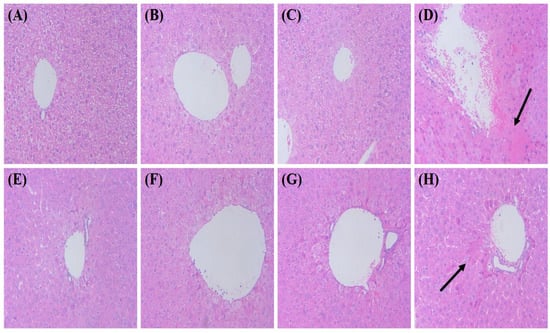 Effects of coffee extracts with various roasting degrees on histopathological changes in LPS (15 mg/Kg.B.W/day)-injected C57BL/6 mice. Ten-week-old male C57BL/6 mice were pretreated with four different roasting degrees of coffee extracts (300 mg/Kg.B.W/day) for 10 days. Liver tissues were stained with hematoxylin and eosin (Original magnification 200×). Arrows indicate liver necrosis surrounding hepatic portal vein. (A) Control; (B) Light; (C) French; (D) LPS; (E) Light + LPS; (F) Medium + LPS; (G) City + LPS; (H) French + LPS. LPS, lipopolysaccharide.