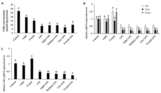 Several studies have reported that the antioxidant capacity of the coffee extracts is reduced as coffee roasting degree increases based on chemical assessment [,,,]. Since the antioxidant functions of roasted coffee extracts should affect physiological metabolism in animals, it is important to assess the biological antioxidant capacity of coffee extracts with different degrees of roasting using animal models. GSH is one of the major indicators of oxidative stress. To assess the oxidative stress and antioxidant effect of coffee extracts with different roasting degrees, we measured GSH concentration using 10-week-old male C57BL/6 mice treated with LPS. Hepatic intracellular GSH concentration was reduced by LPS stimulation, but the decrease was not ameliorated by coffee extract treatments (Figure 2A). Hepatic intracellular GSH concentration was the highest in the group treated with extract from Light-roasted coffee. With the increasing roasting degree of coffee, hepatic intracellular GSH concentration decreased more in non-LPS treated groups. To confirm the cellular mechanism of intracellular GSH reduction by roasting, genes related to GSH synthesis were analyzed. GS is an important enzyme for the synthesis of GSH. GCLC and GCLM are rate-limiting enzymes of GSH synthesis. GPx is also an enzyme that reduces free radicals by oxidizing GSH to convert hydrogen peroxide into water [,]. Although coffee extracts did not significantly affect gene expression under LPS-stimulated conditions, gene expression levels of GS, GCLC, GCLM, and GPx were significantly increased by French-roasted coffee extracts under physiological conditions without LPS stimulation (Figure 2B,C). These results indicate that coffee roasting level does not dramatically affect the physiological antioxidant system in LPS-challenged mice, contrary to the results of previous mouse hepatocyte cellular experiments [].