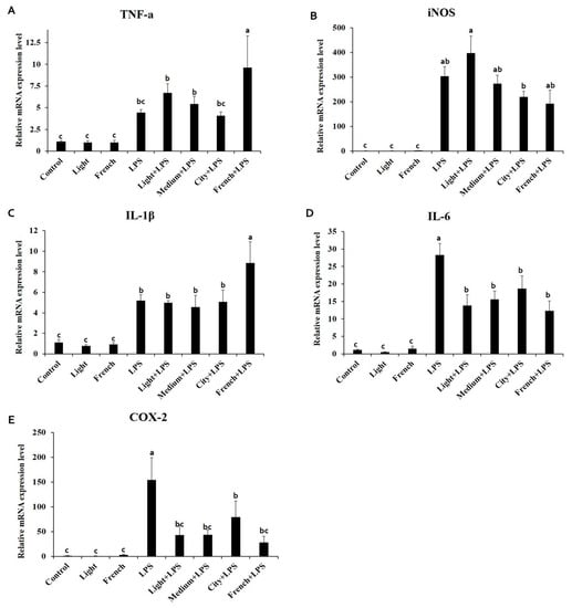 Effects of coffee extracts with different roasting degrees on mRNA expression levels of genes related to pro-inflammatory cytokines in LPS (15 mg/Kg.B.W/day)-injected C57BL/6 mice. Ten-week-old male C57BL/6 mice were pretreated with coffee extracts (300 mg/Kg.B.W/day) of four different roasting degrees for 10 days. mRNA expression levels of (A) TNF-α, (B) iNOS, (C) IL-1β, (D) IL-6, (E) COX-2 were analyzed by qRT-PCR and β-actin was used as a housekeeping gene. Different alphabets indicate significant differences (p < 0.05). Each bar represents the mean ± standard error (n = 6). LPS, lipopolysaccharide; TNF-α, tumor necrosis factor-alpha; iNOS, inducible nitric oxide synthase; IL-1β, interleukin 1-beta; IL-6, interleukin 6; COX-2, cyclooxygenase 2; qRT-PCR, quantitative real-time reverse transcriptase-PCR.