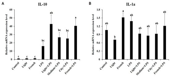 Both interleukin 10 (IL-10) and interleukin 1-alpha (IL-1α) mRNA expression levels were increased by LPS stimulation (Figure 4). Treatment with coffee extracts tended to further increase mRNA expression of IL-10, especially the French + LPS treatment, which significantly increased IL-10 mRNA expression. However, treatment with coffee extracts did not affect IL-1α mRNA expression.