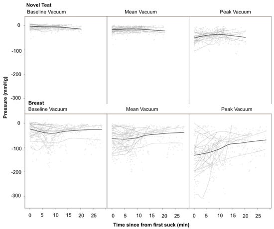 Sucking vacuums over the course of both the breastfeed and novel teat feed. Black lines are local regression smoothers for the full data set; grey lines are local regression smoothers indicating individual infant patterns.