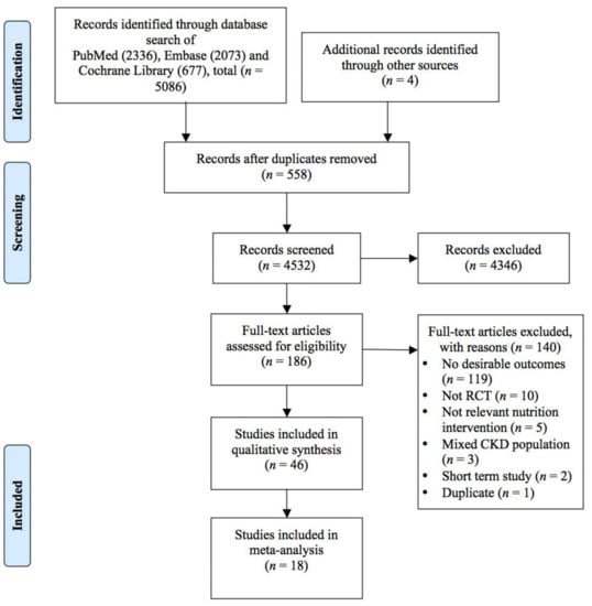 We searched the following database through June 2017: PubMed, Embase, and Cochrane Library to identify all published randomized controlled trials (RCTs) for nutritional intervention in maintenance HD patients that listed inflammatory outcomes. We used “hemodialysis/haemodialysis” AND (“omega-3 fatty acids” OR “alpha-linolenic acids” OR “flaxseed” OR “selenium” OR “vitamin E” OR “tocopherols” OR “tocotrienols” OR “vitamin C” OR “ascorbic acids” OR “antioxidants” OR “alpha-lipoic acids” OR “vitamin D” OR “flavonoids” OR “isoflavones” OR “soy protein” OR “cathechins” OR “green tea” OR “pomegranate” OR “fiber” OR “prebiotics” OR “probiotics”) as the search terms. Citations of studies identified were exported to EndNote version X7.5.3. Two authors (B.H.K. and S.S.N.) independently reviewed the titles and abstracts, and full texts of potential studies were retrieved for further appraisal. In case of disagreement between the two authors, a third author (T.K.) was referred. We also performed a manual search for eligible studies by checking the reference lists of relevant original and review articles.