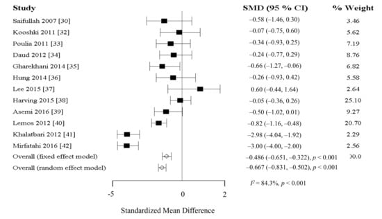 Thirteen studies investigated the effect of omega-3 fatty acid supplementation on the reduction of inflammation in HD patients. Ten studies (total n = 486) used eicosapentaenoic acid (EPA) and docosaahexanoic acid (DHA) from fish oil, while 3 studies (total n = 209) used alpha-linolenic acid (ALA) from flaxseed oil. The dosage of EPA and DHA ranged between 600 to 1933 mg/day and 300 to 967 mg/day, respectively. Two studies [30,31] comparing EPA and DHA to corn oil or soybean oil reported significant reduction in CRP levels. Contrarily, 8 studies [32,33,34,35,36,37,38,39] comparing EPA and DHA to olive oil, paraffin oil, or placebo reported no significant reduction in CRP, IL-6, and TNF-α levels. Three studies [40,41,42] using flaxseed or flaxseed oil reported significant reduction in CRP levels. One study [31] was excluded from the meta-analysis due to lack of required data. Meta-analysis including all 12 studies (n = 662) reported significant difference in CRP (fixed model: SMD = −0.486 mg/L, 95% CI = −0.831, −0.502, p < 0.001; random model: SMD = −0.667 mg/L, 95% CI = −0.651, −0.322; I2 = 84.3%; p < 0.001) (Figure 2). In the subgroup analysis for different forms of omega-3 fatty acids, significant reductions in CRP were observed in studies using EPA and DHA (fixed model: SMD = −0.230 mg/L, 95% CI = −0.395, −0.066, p = 0.011; random model: SMD = −0.238 mg/L, 95% CI = −0.402, −0.073, p = 0.009; I2 = 7.0%; p = 0.377; n = 9 studies with 473 participants) or flaxseed (fixed model: SMD = −1.232 mg/L, 95% CI = −1.397, −1.068, p < 0.001; random model: SMD = −2.218 mg/L, 95% CI = −2.383, −2.054, p < 0.001; I2 = 93.4%; p < 0.001; n = 3 studies with 209 participants).