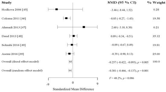 There were 14 studies examining the efficacy of antioxidants, including vitamin C, vitamin E, selenium, and α-lipoic acids on inflammatory outcomes. Of these, only the vitamin E studies were sufficient in number to permit a formal meta-analysis. Two studies [43,44] (total n = 133) investigated supplementation with oral vitamin C, but only one of these, with a bigger sample size and a higher vitamin C dosage (200 mg/day), achieved significant reduction in CRP levels [44]. Another 6 studies (total n = 350) investigated the effects of vitamin E isoforms, tocopherols (TP, n = 5) [39,45,46,47,49], and tocotrienols (TT, n = 1) [48] on inflammatory markers. All 6 studies reported no significant reduction in CRP levels. Two studies [49] using TP reported significant reduction in IL-6 levels post-intervention, while another study [48] using TT did not observe any significant reduction in IL-6 levels. Meta-analysis of all 6 studies (n = 310) reported significant difference in CRP (Fixed model: SMD = −0.257 mg/L, 95% CI = −0.422, −0.093, p = 0.005; Random model: SMD = −0.301 mg/L, 95% CI = −0.466, −0.137, p = 0.001; I2 = 48.2%; p = 0.086) (Figure 3). The anti-inflammatory effect of selenium was examined in 2 studies [50,51] (total n = 124) with similar dose (200 μg) and study duration (3 months). Both studies reported no significant reduction in CRP levels, but significant reduction in IL-6 was reported in one of the studies [50]. Five studies [47,52,53,54,55] (total n = 251) examined the effects of α-lipoic acids supplementation with similar dosage at 600 mg/day for 2 to 3 months. Of the 5 studies, only one study [54] reported significant reduction in CRP levels, while non-significant reduction in IL-6 levels [47,53] and TNF-α levels [53,55] were reported.
