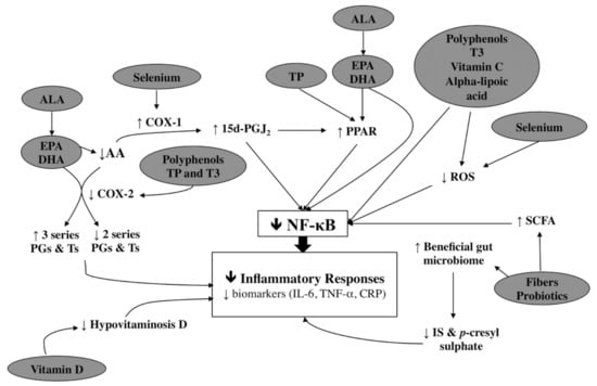 Proposed anti-inflammatory pathways based on reviewed nutritional interventions. Note: NF-κB is involved in the regulation of inflammatory response [16]. Polyphenols [71], omega-3 fatty acids, TP [72], vitamin C [73], alpha-lipoic aicids [74], and selenium [75] inhibit activation of NF-κB by scavenging the ROS. PPAR, a transcription factor that inhibits activation of NF-κB, is upregulated by TP, EPA, and DHA [72,76]. TT suppresses NF-κB gene expression directly [77]. Selenium promotes utilization of AA by COX-1 to generate 15d-PGJ2, an anti-inflammatory prostaglandin that inhibits NF-κB [78]. AA is metabolised by COX-2 to produce pro-inflammatory eicosanoids (PGs and Ts). EPA and DHA compete with AA for the substrate in the lipoxygenase and cyclooxygenase pathway to generate less pro-inflammatory substrates [76]. Polyphenols, TP, and TT inhibit the activity of COX-2 [79,80]. Fibres or probiotics stimulate the growth of saccharolytic bacteria and reduce the production of uremic toxins in the gut [18]. In addition, fermentation of soluble fibre produces SCFA, which inhibit the activities of NF-κB [81]. Abbreviations: 15d-PGJ2, 15-deoxy-Δ12,14-prostaglandin J2; AA, arachidonic acid; ALA, alpha-linolenic acid; CRP, C-reactive protein; COX, cyclooxygenase; EPA, eicosapentaenoic acid; DHA, docosahexaenoic acid; IL-6, interleukin 6; IS, indoxyl sulphate; NF-κB, nuclear factor kappa B; PJ, pomegranate juice; PGs, prostaglandins; PPAR, peroxisome proliferators active receptors; ROS, reactive oxygen species; SCFA, short chain fatty acids; TT, tocotrienols; Ts, thromboxanes; TNF-α, tumor necrosis factor alpha; TP, tocopherols. Footnote: ↓, reduce; ↑, increase.