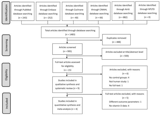 Two independent reviewers (M.-D.L. and C.-Y.L.) assessed the eligibility of each paper after the initial search was conducted. The inclusion criteria were (1) inclusion of a controlled group in the study design; (2) administration of influenza vaccination; (3) measurement or supplementation of vitamin D; (4) reporting of at least one immunological response to influenza vaccination. The following criteria were excluded: (1) articles irrelevant to the topic; (2) duplicate publications; (3) trials with a crossover study design; (4) animal studies; and (5) case reports and studies which excluded a controlled group.