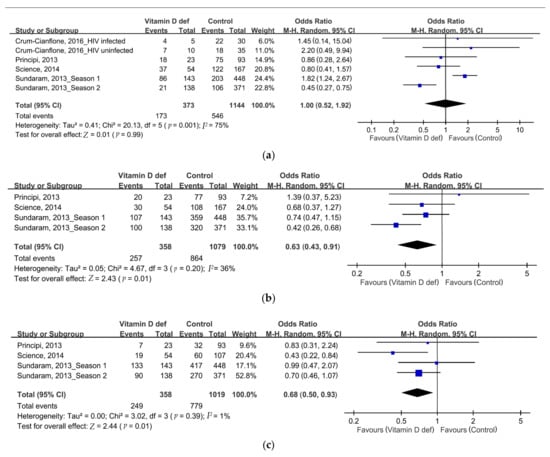 Forrest plot of the SP rates of influenza vaccination in the VDD (vitamin D deficiency) and placebo groups. (a) Strain A/H1N1; (b) strain A/H3N2; (c) strain B. df = degrees of freedom; def = deficiency; M-H = Mantel-Haenszel.