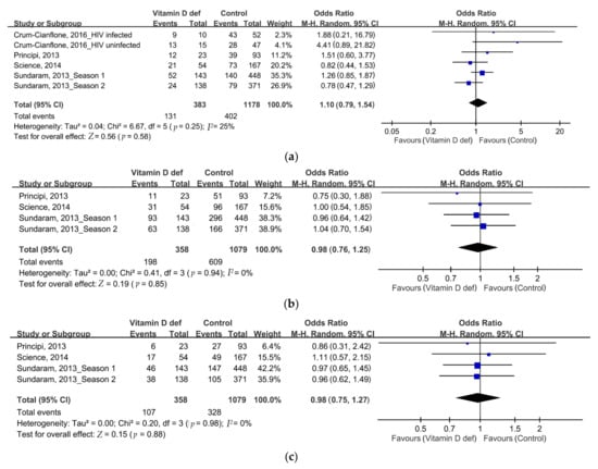 Forrest plot of the seroconversion (SC) rates of influenza vaccination in the VDD and placebo groups. (a) Strain A/H1N1; (b) strain A/H3N2; (c) strain B.