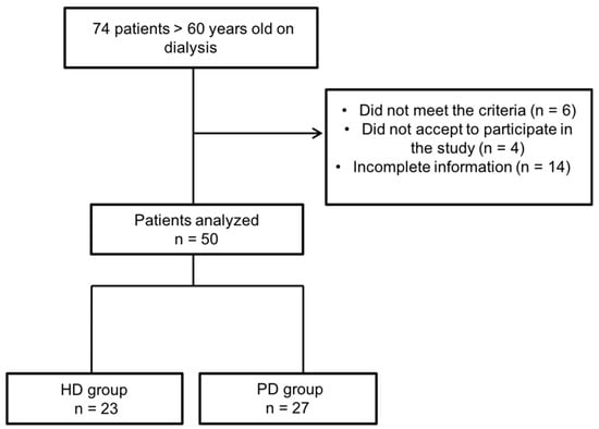 This was a cross-sectional study in a clinically stable group of geriatric patients that was performed from April 2015 to May 2016. The study was approved by the ethics committee “Institutional Committee for Biomedical Research in Humans”, on 31 March 2015 (NMM-1462-15/16-1). Patients undergoing hemodialysis (HD) or peritoneal dialysis (PD) at our institution were invited to participate either by phone or in person at the hospital and those who accepted where given an appointment for the first assessment. Informed consent was obtained from all patients.