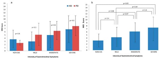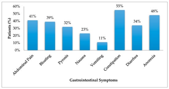 The high prevalence of symptoms observed in our population is consistent with that found in other studies [,,,]. Most studies take into account patients of all ages, so that few consider being older as a risk factor in the presence and severity of GIS [,]. However, in this study, the increase in the age range did not influence either the higher prevalence or severity of symptoms.