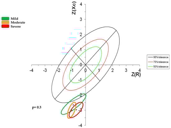 Figure 4 shows the bivariate distribution of the standard deviates of resistance/height (R/H) and reactance/height (Xc/H), both with zero mean, unit standard deviation, and correlation coefficient from a healthy population according to the RXc score graph methodology []. The two standard deviates of the bivariate Z-score vector are calculated from individual R/H and Xc/H data as Z(R) = (R/H − the mean value)/SD, and Z(Xc) = (Xc/H − the mean value)/SD, that is with respect to the means and standard deviations of a specific, reference population by race, gender, and age range. The long axis of the Z score ellipse represents hydration status, whereas the short axis represents body tissue; the upper side of the long axis represents deficit of hydration status (dehydration) and the low side of the long axis represents excess of hydration status (anasarca), the right side of the short axis represents loss of tissue (muscle at the top right side and fat at the low right side), the left side of the short axis represents excess of tissue (excess of muscle at the top side and excess of fat at the low left side). This RXC score graph methodology represents simultaneously tissue and hydration status of a patient with volume overload as our patients. In our Z score graph it was observed that the three groups that had been assigned according to severity of GIS are in the lower right quadrant, out of the 75% pole, indicating that loss of tissue (fat) and volume overload occurred regardless of the severity of the GIS.