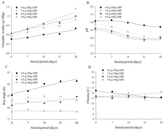 | Stored Period (Days) | GBP Concentration (g/100 g) | |||