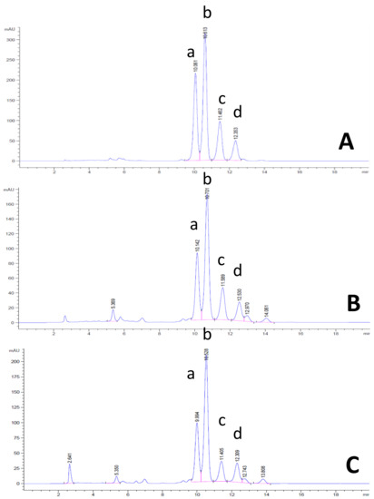 HPLC chromatogram of reference γ-oryzanol and NPRBOs. (A) γ-oryzanol, which is composed of cycloartenyl ferulate(a), 24-methylenecycloartanyl ferulate (b), campesteryl ferulate (c), and sitosteryl ferulate (d); and NPRBOs, including (B) Khao’ Gam Leum-Phua and (C) Khao’ Gam Pah E-Kaw.