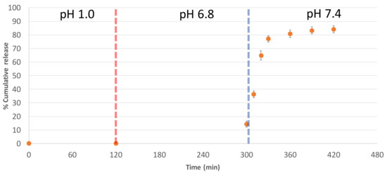 In vitro NPRBO release from film-coated tablets (n = 5) in three-phase simulated gastrointestinal pH media.