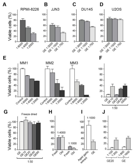 Mammalian cancer cell lines (DU145, U2OS and 67NR) were sub-cultured and maintained in DMEM or RPMI-1640 (BioWhittaker, Walkersville, MD, USA) supplied with 10% FBS, 250 µg/mL amphotericin B (Sigma-Aldrich), 100 µg/mL gentamycin (Invitrogen, Carlsbad, CA, USA), and 2 mM glutamine (BioWhittaker). JJN3 and RPMI-8226 cells were grown in RPMI-1640 (Sigma, St. Louis, MO, USA) with the same supplements. Cells were seeded out in 96 well plates (5000 cells/well) and garlic extracts, cytostatic drugs, and combinations of these in given concentrations were added the same day. Cells were harvested on days 1–4 using the MTT (3-(4,5-dimethylthiazol-2-yl)-2,5-diphenyltetrazolium bromide)-assay as described [26]. The average from six wells was used to calculate cell survival.