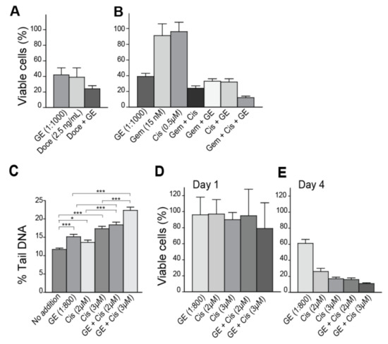 GE inhibits growth and increases the efficacy of genotoxic drugs in breast cancer cells. (A,B) Viability of the breast cancer cell line 67NR, measured by MTT-assay on day four, after the addition of (A) GE (diluted 1:1000), docetaxel (Doce) (2.5 ng/mL), and a combination of these at same concentrations; and (B) GE (diluted 1:1000), cisplatin (Cis) (0.5 µM), gemcitabine (Gem) (15 nM), and double and triple combinations of these at the same concentrations. (C) Comet assay on 67NR cells on day one (16–20 h), after the addition of GE diluted at 1:800, alone and in combination with high dose cisplatin (Cis) (2 and 3 µM). Data presented are from two independent biological replicas. Two tailed, unpaired t-test, *** p < 0.001, * p < 0.02. (D,E) Viability of 67NR cells measured by MTT-assay on (D) day one and (E) day four, after the addition of GE (diluted 1:800), alone and in combination with cisplatin (Cis) (2 and 3 µM). All MTT data presented represent one experiment out of at least two similar experiments with the same results. Mean relative viability ± SD of 3–6 technical replicas are shown.