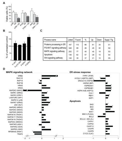Changes in multiple signalling pathways are reported in cells exposed to various OSCs (reviewed in [14]). We found that GE increased the efficacy of inhibitors against p38 (SB20358), PI3K (LY294002) and JNK (SP600125), and western blot analysis suggested that GE affected the MEK/ERK and PI3K/AKT/S6K signalling pathways (Figure 3A,B), supporting the idea that OSCs can influence multiple signalling pathways. In order to get a more comprehensive view of how cellular signalling was affected by GE, we analysed the extracts from treated cells, using the non-targeted, highly sensitive, and reproducible multiplexed inhibitor bead (MIB)-assay [31,32]. This is an assay in which multiple kinase inhibitors coupled to sepharose beads are used as an affinity matrix for kinases and NTP interacting proteins/protein complexes, prior to identification by mass spectrometry. Using this assay, 4885 proteins were detected and quantified, including 67 signalling phosphatases, 119 ubiquitin ligases, and 189 signalling kinases. Significant changes in GE-treated versus untreated cells were found for over 1000 proteins (quantitative changes of all proteins detected are shown in Supplementary Table S1). KEGG (Kyoto Encyclopedia of Genes and Genomes) analysis of these proteins showed that GE-induced changes in proteins involved in endoplasmic reticulum (ER) processing, PI3K/AKT, MAPK, apoptosis and Wnt signalling (Figure 3C). Quantitative changes of some of the signalling proteins in these pathways are shown in Figure 3D, including multiple proteins in the ER stress response.