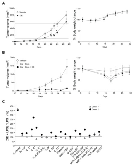 GE reduces breast cancer growth in vivo and partly influences the cytokine response from lipopolysaccharide (LPS)-stimulated monocytes. (A,B) 67NR breast cancer cells were injected into the fourth mammary fat pad of female BalB-C mice. (A) The mice were treated with vehicle (6.5 µL 20% ethanol in 200 µL NaCl, n = 16) and GE (6.5 µL in 200 µL NaCl, n = 16) intraperitoneally (i.p.) once every day from day one (two-tailed, unpaired, t-test, * p < 0.05). (B) The mice that were treated with vehicle (6.5 µL 20% ethanol in 200 µL NaCl, n = 16), Gem + Cis (gemcitabine (0.5 mg/kg) + cisplatin (3 mg/kg), i.p., 200 µL, n = 15, given once per week for three weeks, starting at day eight), alone and in combination with GE (6.5 µL in 200 µL NaCl, n = 16, i.p., once every day from day one). Mean ± SEM are shown. (C) The % increased levels of cytokines released by monocytes stimulated with GE (1:1000) + LPS (10 ng/mL), relative to monocytes stimulated by LPS only (horizontal line). Only cytokines that had >2 folds induction by addition of LPS are shown.