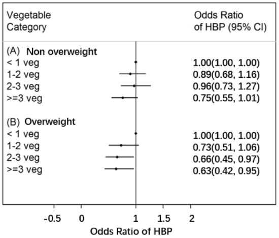 The analyses were further performed in different BMI groups, with the least daily vegetable consumption group being the reference group. In the overweight group only, there was a statistically significant relationship between the consumption of two or more servings of vegetables per day and a decline in the odds of HBP, with OR of 0.66 (95%CI = 0.45~0.97) for the 2–3 servings group and an OR of 0.63 (95%CI = 0.42~0.95) for the more than 3 servings group (Figure 1).