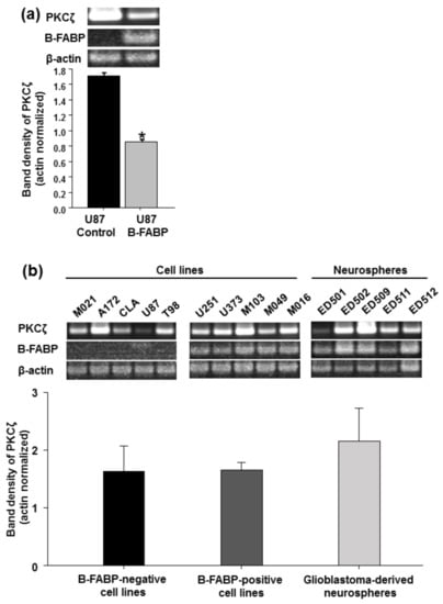 An initial survey of PKC RNA levels in stably transfected U87 GBM control cells (B-FABP-negative) versus stably transfected U87 B-FABP (B-FABP-positive) cells [31] was carried out using cDNA gene expression microarray data. B-FABP expression in U87 cells affected the RNA levels of several PKC genes (Table 1). For example, PKCα, δ, and η were upregulated 1.6-, 1.6-, and 1.89-fold, respectively, whereas PKCε, ι, and ζ were downregulated 3-, 1.8-, and 25-fold, respectively, compared with U87 control cells. PKCζ showed the most pronounced change in gene expression as a result of B-FABP expression. Therefore, we studied this gene further by semiquantitative RT-PCR analysis. In general agreement with our microarray data, ectopic B-FABP expression in U87 cells was associated with a reduction in PKCζ RNA levels (Figure 1a).