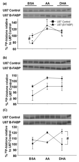 Some novel PKC genes such as PKCδ [28] and ε [42,43] were shown to be involved in GBM migration and invasion whereas PKCη [44] is associated with cell proliferation. To our knowledge, the effects of ω-3 and ω-6 fatty acids on novel PKCs have not been explored in GBM. Here, we show that AA and DHA do not significantly alter overall novel PKC activity in U87 cells, with no change being observed when B-FABP is ectopically expressed. This is in contrast to normal dog cardiomyocytes, in which a fish-oil-rich diet was shown to decrease PKCδ and ε activation [39]. In addition, AA was shown to activate PKCε and PKCµ in the B-FABP-positive human breast cancer cell line MDA-MB-435, with consequent enhancement of cell adhesion [17].