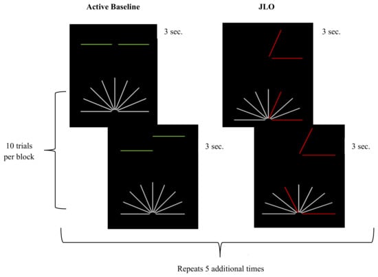 JLO task design. The figure provides a visual schematic of the judgement of line orientation (JLO) task. The two blocks (i.e., active baseline and JLO) were presented a total of six times, resulting in a total acquisition time of 6 min, 33 s. Ten stimuli were presented in each block in a random order with replacement for the active baseline and a sequential order from a library of 144 images for the JLO task.